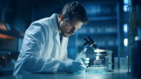A scientist surrounded by vials and beakers in a modern laboratory, proudly displaying a vaccine.