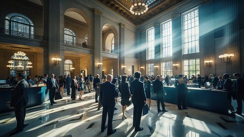 A businesswoman in a suit carrying a briefcase and walking through a busy banking hall.