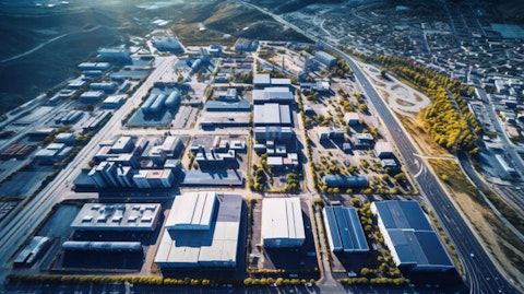 Aerial view of large industrial park with multiple buildings and supply-constrained submarkets. Editorial photo for a financial news article. 8k. –ar 16:9