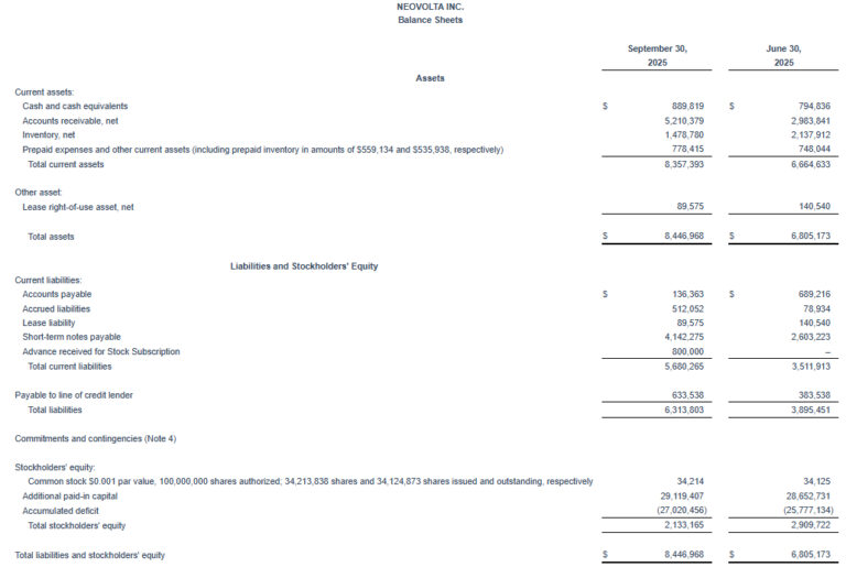 NeoVolta Inc. (NASDAQ:NEOV), a U.S.-based energy technology company delivering scalable storage, for resilient residential and commercial power infrastructure, today announced financial results for its first quarter of fiscal 2026, which ended September 30, 2025.