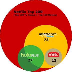 To the degree they have some of the same content as Netflix, [Amazon, Hulu Plus, and Redbox] are potentially a substitute for Netflix. To examine this, we looked at the top 200 titles on Netflix: our 100 most popular movies and our 100 most popular TV shows in Q4. Of these 200, 113 are not on Amazon (NASDAQ:AMZN) Prime, Hulu Plus or Redbox Instant. Of the 87 that are available on at least one of these services, Hulu Plus offers 27 of the 200; Amazon Prime 73 of the 200; and Redbox Instant 12 of the 200, with significant overlap in TV between Hulu Plus and Amazon Prime, and in movies between Amazon Prime and Redbox Instant. In other words, when it comes to the most popular content with members on Netflix, none of these services are good substitutes to Netflix.