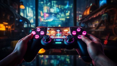 A close up of an employee’s hands at a digital gaming console, controlling a popular game.