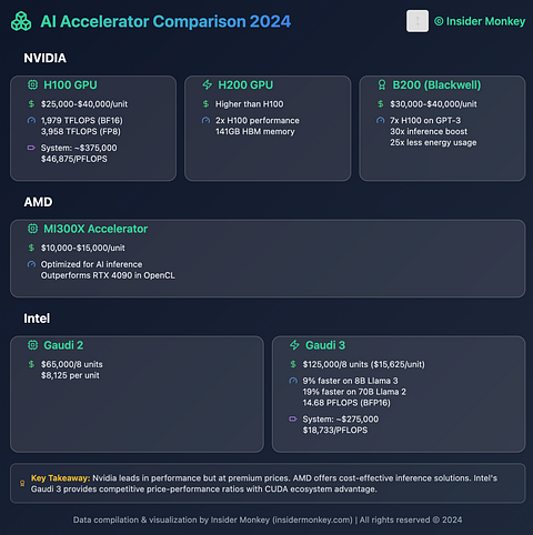 The underdogs AMD and Intel are making significant strides against Nvidia. However, they’re more focused on trying to undercut Nvidia’s chips instead of trying to outperform them. AMD’s Instinct MI300X chip focuses on inference workloads and Intel’s Gaudi 3 accelerator is positioning itself as a more cost-effective alternative.