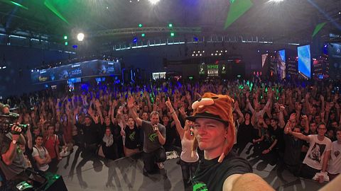 A close-up of a colorful high-end graphics card being plugged in to a gaming computer.