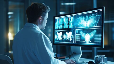 A doctor examining the results of a patient’s medical scan displayed on a computer monitor.