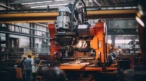 A close-up of a large piece of heavy machinery being manufactured in a modern factory setting.