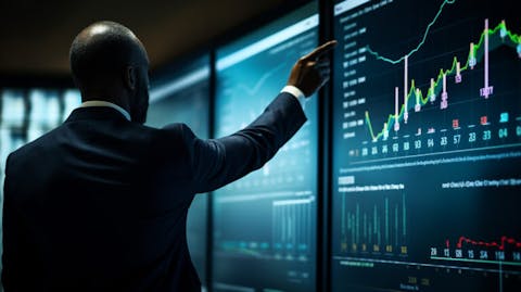 A close-up of an executive of a regional bank, pointing to a financial chart on a projection screen.