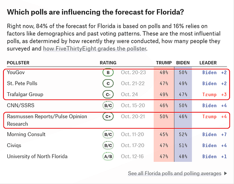 Now take a look at the results of recent Florida polls below. The polls that are conducted in the last 5 days show a much tighter margin. There are a total of 4 polls during the last 5 days and Donald Trump is actually leading Joe Biden by an average of 0.75 points. Please keep in mind that these polls are still BIASED. Four years ago fivethirtyeight predicted that Trump would win Florida by 0.1 points, but Trump won Florida by 1.2 points. If we assume that fivethirtyeight’s current BIAS is also 1.1 points in favor of Biden, we can see that Trump will win Florida by 1.75 points if elections were held today (last 4 polls’ average is 0.75 points for Trump plus 1.1 bias points for Trump will give us 1.75 points Trump victory). That’s why I currently believe that Trump will win Florida, not Biden.