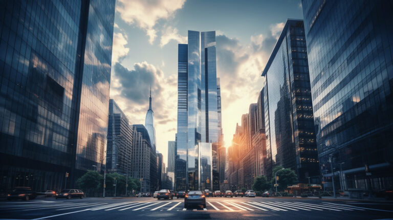 A modern skyscraper in a busy city, symbolizing the prominence of the financial services company.