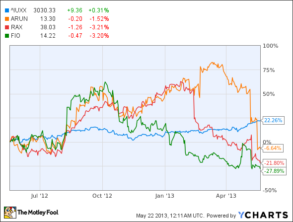 Rackspace Hosting, Inc. (NYSE:RAX)The divergence of a poor-performing stock is most evident when the stock indices keep rising. So when a company vastly underperforms a rising stock market, investors should take notice. Take, for instance, the Nasdaq 100 index. In a one-year period, the index is up 22%, while Aruba Networks, Inc. (NASDAQ:ARUN), Rackspace Hosting, Inc. (NYSE:RAX), and Fusion-IO, Inc. (NYSE:FIO) are all down. In the last month, Aruba dropped 40%, trading at around $13.30 recently. By contrast, Fusion-io and Rackspace Hosting, Inc. (NYSE:RAX) are down around 28% and 22%, respectively: