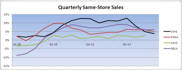 The graph below shows quarterly new store growth annualized.  The Cheesecake Factory was left off given little to no new store growth in the last several years.
