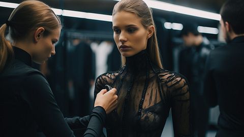 A model wearing Wolford’s new line of fashion pieces while getting ready before a runway show.