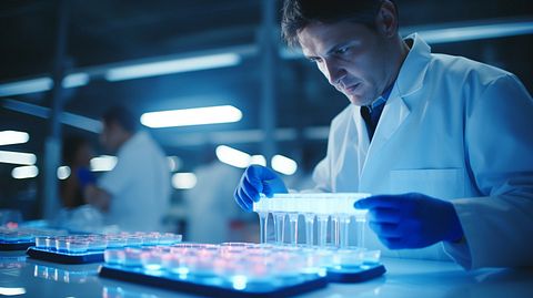 A scientist in a laboratory carefully analyzing a sample of cord blood.
