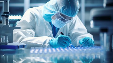 A microbiologist studying a petri dish culture of a gene therapy on a microscope.