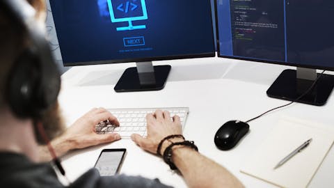 A team of software engineers at desks working on code for a cutting-edge cloud computing solution.