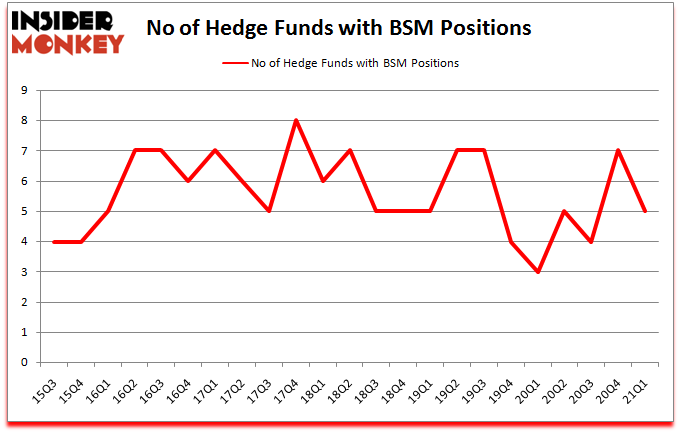 At the end of the first quarter, a total of 5 of the hedge funds tracked by Insider Monkey were long this stock, a change of -29% from one quarter earlier. The graph below displays the number of hedge funds with bullish position in BSM over the last 23 quarters. With hedge funds’ capital changing hands, there exists a select group of notable hedge fund managers who were boosting their holdings meaningfully (or already accumulated large positions).