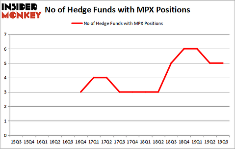 Heading into the fourth quarter of 2019, a total of 5 of the hedge funds tracked by Insider Monkey were long this stock, a change of 0% from the second quarter of 2019. The graph below displays the number of hedge funds with bullish position in MPX over the last 17 quarters. With the smart money’s positions undergoing their usual ebb and flow, there exists an “upper tier” of key hedge fund managers who were boosting their holdings significantly (or already accumulated large positions).