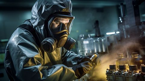 An industrial worker in a protective suit operating a complex chemical process.