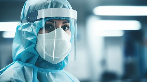 A hospital worker in full protective gear demonstrating the companies infection prevention solutions.