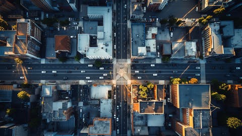 An aerial view of a city showing the presence of public safety solutions such as Shot Spotter All in One.