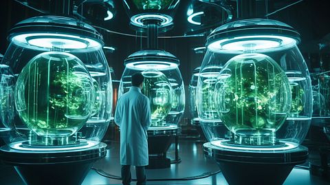 A scientist surrounded by bioreactors and stem cell technology in a laboratory.