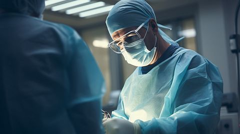 A medical professional wearing a face mask and a surgical gown performing a spine surgery in a hospital operating room.
