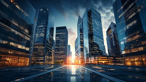 A wide angled view of a high-rise office building, the windows reflecting a nearby cityscape.