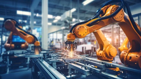 A worker operating a robotic arm in a semiconductor manufacturing facility.