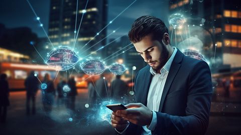 A customer happily using their mobile device in a busy urban setting.