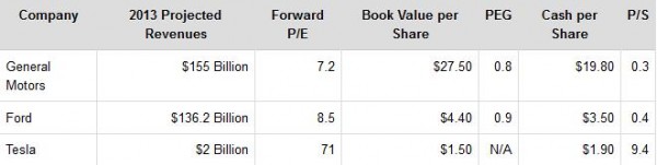 The reason for my bearish view on the company’s stock is Tesla’s valuation, not its products. While the model S and Tesla are both new and impressive, the company is currently significantly overvalued compared to the rest of the automotive sector. As I mentioned above, Tesla is currently trading on a forward earnings multiple of 71. Meanwhile, it’s larger, older and more diversified peers such as General Motors Company (NYSE:GM)Ford Motor Company (NYSE:F), Toyota Motor Corporation (ADR) (NYSE:TM), Nissan Motor Co., Ltd. (ADR) (PINK:NSANY) and Honda Motor Co Ltd (ADR) (NYSE:HMC) are all trading on an average forward earnings multiple of 11.7 – indicating that Tesla would have to drive its earnings higher by 600% to bring is valuation in line with that of its peers.