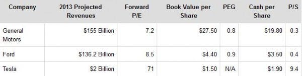 The reason for my bearish view on the company’s stock is Tesla’s valuation, not its products. While the model S and Tesla are both new and impressive, the company is currently significantly overvalued compared to the rest of the automotive sector. As I mentioned above, Tesla is currently trading on a forward earnings multiple of 71. Meanwhile, it’s larger, older and more diversified peers such as General Motors Company (NYSE:GM), Ford Motor Company (NYSE:F), Toyota Motor Corporation (ADR) (NYSE:TM), Nissan Motor Co., Ltd. (ADR) (PINK:NSANY) and Honda Motor Co Ltd (ADR) (NYSE:HMC) are all trading on an average forward earnings multiple of 11.7 – indicating that Tesla would have to drive its earnings higher by 600% to bring is valuation in line with that of its peers.