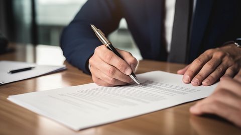 A close-up of a borrower signing off a loan with a smile on their face.