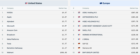 Comparison of the largest companies in Europe vs the largest US companies