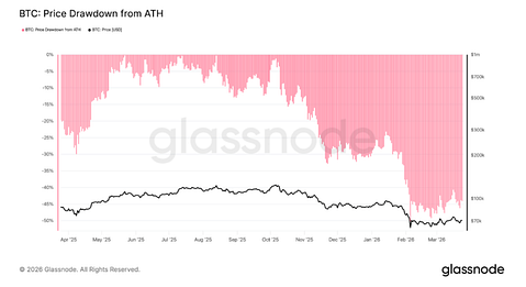 Bitcoin price reached -44% drawdown from the all-time high in March 2026. Source: Glassnode.