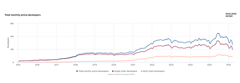 Monthly number of active crypto developers as of the end of March 2026. Source: Electric Capital.