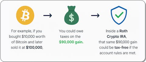 Think of it like this. You get the growth potential of Bitcoin and Ethereum, combined with the tax perks of a retirement account like an IRA. Instead of losing a chunk of every gain to the IRS, your money stays in the account and could keep growing for you.