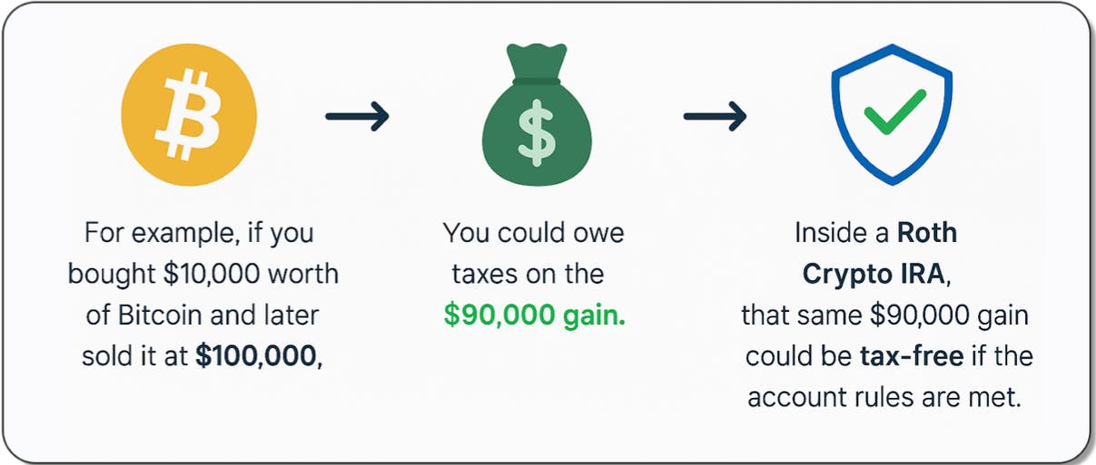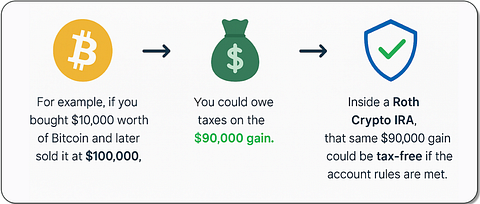 Think of it like this. You get the growth potential of Bitcoin and Ethereum, combined with the tax perks of a retirement account like an IRA. Instead of losing a chunk of every gain to the IRS, your money stays in the account and could keep growing for you.