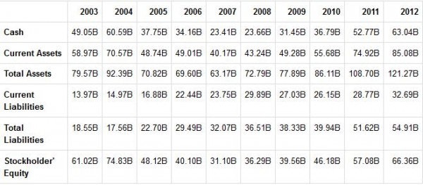 If you look at the table below though, shareholders’ equity has gone up exponentially since 2010. With $63 billion in short-term investments and $10.7 billion in long-term debt (only $1.23 billion of that counted as current) as of December, 2012, the company seems to be in a healthy financial position.