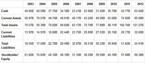 If you look at the table below though, shareholders’ equity has gone up exponentially since 2010. With $63 billion in short-term investments and $10.7 billion in long-term debt (only $1.23 billion of that counted as current) as of December, 2012, the company seems to be in a healthy financial position.