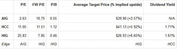 1). Hartford’s current P/E is 25.83, which is quite high, compared to industy’s average, and, in principle, would not suggest that the company is undervalued. However, the forward P/E and the P/B ratios paint a different picture. The stock’s forward P/E is an attractive 7.85 (the lowest of the three stocks analyzed in this post), and the P/B is very low as well, at just 0.46, even lower than AIG’s.