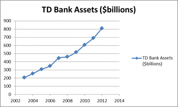 As a result of its convenient nature and responsible practices, TD Bank has thrived.  As shown in the chart below, the amount of TD’s total assets has quadrupled in the last decade alone.