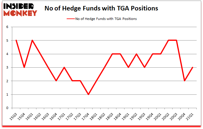 At first quarter’s end, a total of 3 of the hedge funds tracked by Insider Monkey held long positions in this stock, a change of 50% from the fourth quarter of 2020. Below, you can check out the change in hedge fund sentiment towards TGA over the last 23 quarters. So, let’s see which hedge funds were among the top holders of the stock and which hedge funds were making big moves.