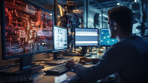 A student operating a computer numeric control machining program, surrounded by computer technology.