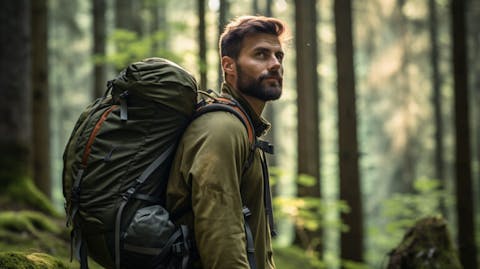 A hiker in a forest with a backpack of outdoor equipment highlighting the company’s lifestyle products.