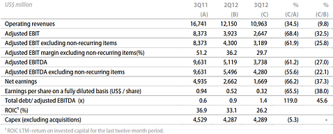Vale’s recent quarterly results cannot be described as anything but dismal. Net sales fell 34 percent to $10.7 billion and adjusted EBITDA fell 62 percent to 3.74 billion reais. EBITDA margin fell from 59% to 39%. Vale’s realized price per metric ton of iron ore, which comprises about 90% of Vale’s profits, averaged $112.12, a decrease of 36% on one year earlier. Net earnings were US$ 1.7 billion in 3Q12, equal to US$ 0.32 per share. Net earnings fell 66% on one year earlier and 37% on the previous quarter.