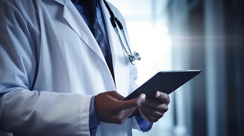 A medical professional using a tablet device, illustrating the power of interoperability solutions.