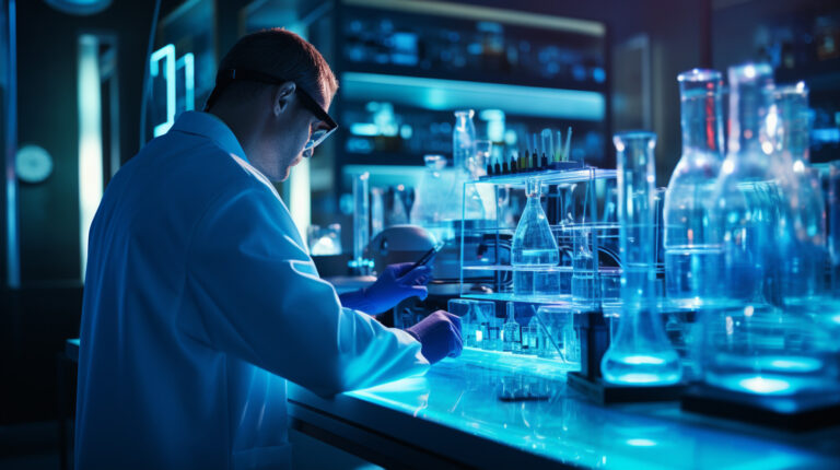 A technician recording data from a complex experiment involving pharmaceutical products.