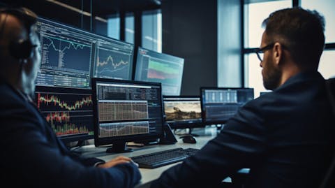 A team of actuaries and engineers at a computer looking at the data and finding the best reinsurance solution for a client.