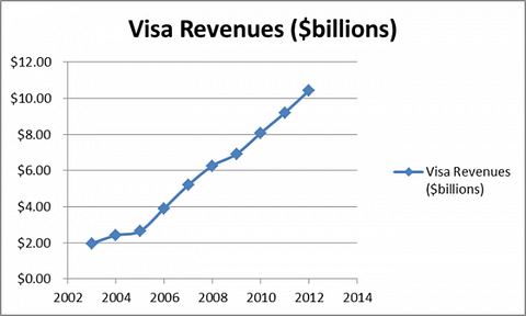 Visa primarily earns its money from card service fees and other various processing fees. In fiscal year 2012, the company processed 66 billion transactions worth a staggering $3.9 trillion; a growth of 7% from the year before. In fact, over the past decade, Visa has grown its revenues tremendously (almost linearly), from less than $2 billion in 2003 to over $10 billion now.