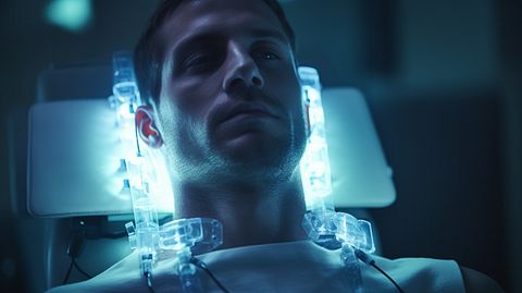 A close-up shot of a male patient in a clinical trial, receiving the latest therapeutic treatment with a BET inhibitor.